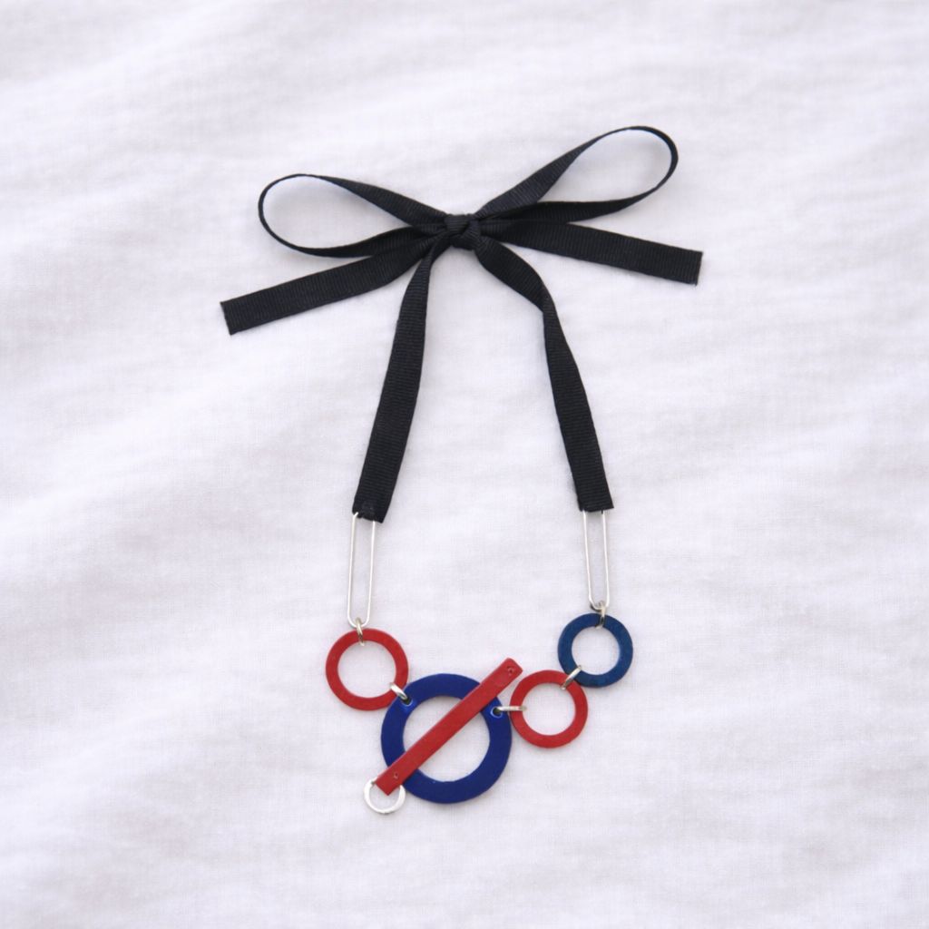 * Material: Aros de acrílico reciclado en azul profundo y rojo vibrante, unidos por conectores metálicos livianos.